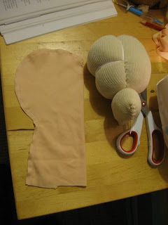 I cut the line at her neck, and then cut her eyeline and chin line. All that shaping was gone in an instant. I was so scared that I was causing irreversible damage at this point that I don't even think I was breathing. I peeled back the stockinette that encapsulated her head like fascia, and then I held her head together with one hand as I used my other hand to carefully wrap large strips of new wool batting around her. By then her head looked enormous, and I had to call Einstein to come and help tug her original stockinette back over her head while I held everything in place. I pulled a new tube of stockinette over the old tube, just to keep everything nice and tidy.